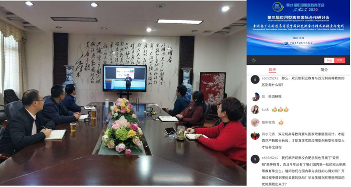 本次研讨会邀请了8位国内外应用型高校及机构的校领导、专家学者分别围绕会议主题作了主旨报告,共同研讨应用型高校如何应对全球疫情对教育国际合作产生的深远影响,探讨后疫情时代应用型人才培养的新思路与新模式,为推动国际化应用型人才培养质量提升提供有益借鉴。与会发言人与线上参会人员进行了讨论与互动。中外专家与参会人员突破了障碍相聚云端,共同探讨应用型高校建设和发展。