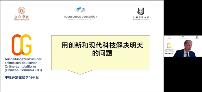 Im Namen des Bildungsministeriums der Provinz Anhui gratuliert Zhang Geng zur Unterzeichnung der drei Hochschulen. Er sagte, dass die Universität Hefei und die Hochschule Osnabrück einen guten Kooperationsmechanismus des gegenseitigen Respekts, der gegenseitigen Unterstützung und des gegenseitigen Vertrauens in engem Austausch etabliert und eine gemeinsame berufliche Entwicklung, eine gemeinsame Ausbildung von Studierenden und einen gemeinsamen Versuchsaufbau realisiert hätten. Er betonte, dass die Zusammenarbeit zwischen den drei Hochschulen eine neue Erkundung und einen Fortschritt in der chinesisch-deutschen Zusammenarbeit und der integrierten Entwicklung des Jangtse-Deltas darstelle . Der Bau und die Aktivierung einer offenen Online-Lernplattform hät ten eine Online-Freundschaftsbrücke und Autobahn für deutsch-chinesische Zusammenarbeit und Austausch errichtet. Es erschloss neue Bereiche und neue Räume für die deutsch-chinesische Zusammenarbeit und den Austausch. Das Bildungsministerium der Provinz Anhui wird weiterhin die Kooperationsprojekte der Universität Hefei und die Errichtung einer hochrangigen Universität der Universität Hefei unterstützen.