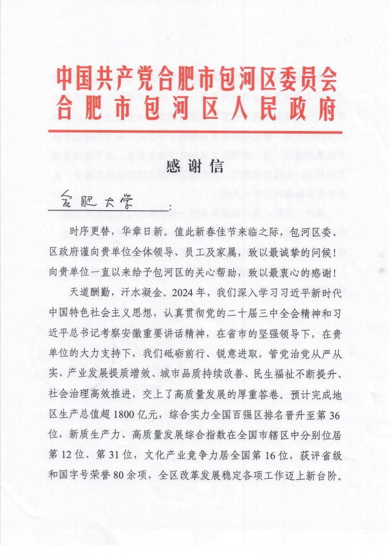 合肥市包河区委区政府向我校发来感谢信