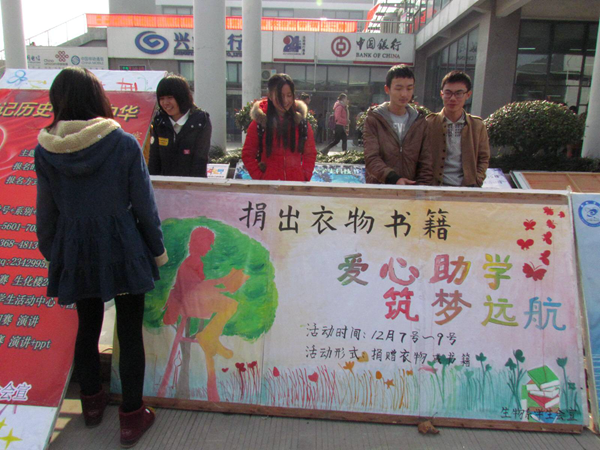 经过前期的心灵沟通和了解,帮扶儿童与志愿者之间的理解和认识都逐渐加深,志愿者在寒假开始前就着手为孩子们准备寄去新年的礼物,有书包、文具、书籍、衣物以及饱含志愿者温暖爱心的祝福贺卡等。寒假前生物系服务队在我校食堂门口开设展板宣传点,向来往师生介绍此次活动的宗旨及募捐方式,以展板宣传、班级宣传、入室宣传等方式鼓励各位同学参与其中献出自己的爱心,向陡张村弱势儿童伸出援助之手。在同学们对此次募捐活动有了初步了解之后,志愿者服务队在各寝室正式开始了募捐活动,同学们积极响应,捐出书籍、衣物等各类生活学习用品,希望这些爱心用品能够为帮扶儿童提供一些力所能及的帮助。