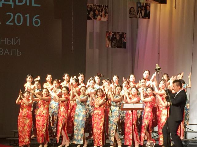14日我校代表团在下诺夫哥罗德国立大学参与了本次艺术节演唱会,与俄罗斯青年合唱团、莫斯科室内合唱团、俄罗斯混声合唱团、俄罗斯女子合唱团等五个知名合唱团体联袂演出。我校学生演唱了《彩云追月》、《回娘家》等中国民族歌曲,具有民族特色喜庆的服装,整齐欢快的舞蹈动作,清新婉悠的和声,现场掌声雷动,让俄罗斯人民目睹了中国传统音乐和中国文化元素的无穷魅力,也让现场观众真切感受和喜欢上中国悠久丰富的艺术底蕴和文化内涵。