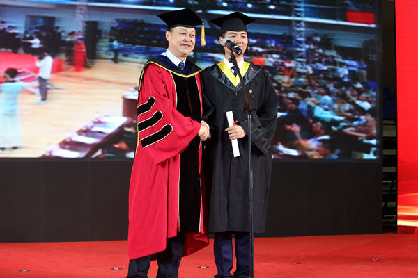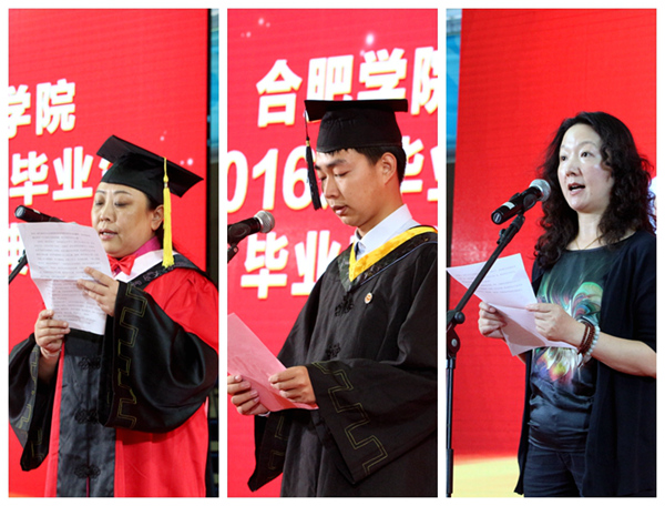 洪家友、陈秀、刘建中为校第十一届“十大榜样学子”代表和西部计划毕业生代表颁奖并颁发毕业纪念品;优秀校友、毕业生家长、企业HR代表为各系优秀毕业生代表颁奖;合肥学院客座教授、韩大文化交流有限公司董事长赵诚惠女士为优秀留学毕业生代表颁奖。第十一届“十大榜样学子”化工系毕业生代表席宏飞,教师代表教育系主任江芳教授和经开区人力资源协会会长贾珍珍分别做出发言。席宏飞在发言中表示深情地表达了他对学校、老师以及家长的感恩与感激之情,更也表达了对各位毕业生的祝愿。