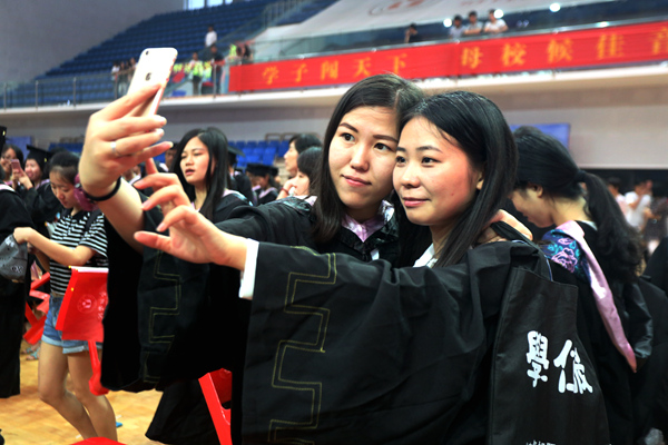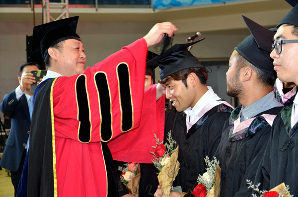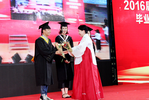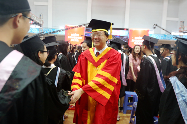 在庄严肃穆的国歌声中,2016届毕业生们满怀豪情、英姿飒爽,五星红旗冉冉升起。刘建中宣读学位授予文件,蔡敬民为优秀毕业生代表拨流苏并与他们合影留念。