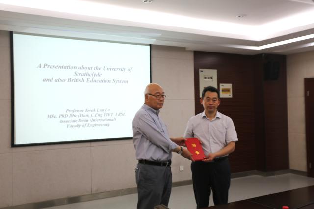 近期,英国皇家科学院院士、University of Strathclyde(斯特拉斯克莱德大学)工程院副院长罗国麟教授来访我校,罗教授此次来访是为了落实张文兵校长7月初访问该校商谈的合作事宜。7月20日,罗国麟教授分别与我校工科及商科相关系部就开展联合培养项目进行了深入交流。7月21日罗教授应邀为我校师生做了一场学术报告,校长张文兵参加报告会,并在会前为罗国麟教授颁发了客座教授聘书,相关系部主任、青年教师及学生代表约60余人聆听了报告会。