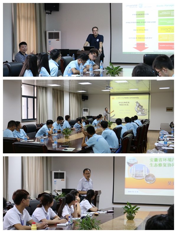 此次夏令营活动持续五天,活动内容包括三个方面:(1)请国内外环境领域的专家作专题报告;(2)参观先进的环保企业、研究院所和实验室;(3)自选课题分组开展合作学习与研究。结合本次夏令营主题,特邀请中国国家友谊奖获得者、德国罗斯托克大学莱勒斯教授,安徽省环境保护厅殷福才副厅长,安徽合大环境检测有限公司韩蔚总经理,合肥学院科技处处长吴克教授和合肥学院生物与环境工程系主任俞志敏教授等环保领域国内外专家分别作了有关新环保法、德国固废处理方法和生物炭处理有机污染物、环保案例分析和安徽省环境污染防治与生态修复协同创新中心概况等精彩报告,每个报告都深入浅出的向营员们展示了专家们在这些领域的研究成果。