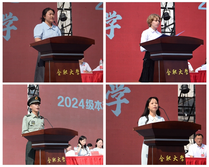 在开学典礼上,本科新生代表、设计学院工业设计专业的王雪婷表示,新时代大学生生逢其时、重任在肩,要以爱国之心为引领,以勤奋学习为基石,以实践创新为动力,在大学的舞台上绽放光彩。留学生代表、2024级会展专业的玛利雅表示,将当好友谊使者和合作桥梁,讲好中国故事,为促进国际文化交流合作贡献青春力量。优秀校友代表、14级汉语言文学专业的李道国寄语新生珍惜岁月,努力学习实践、思考探索,用青春和汗水践行使命担当。教师代表、经济与管理学院江玉荣老师鼓励学生培养批判性思维,秉持“长期主义”对待学习和生活,树立与国家民族命运紧密相连的远期目标,把个人融入国家发展、民族复兴的历史大潮中。