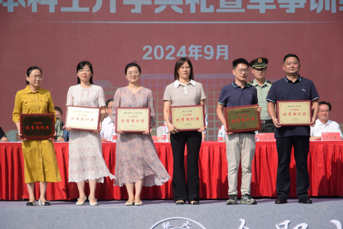 吴功福宣读了2024级本科生军事训练表彰文件,与会领导为军训先进集体和先进个人代表依次颁奖,共有6个二级学院获得“军训优秀组织”荣誉称号,200名学生获得“军训先进个人”荣誉称号。