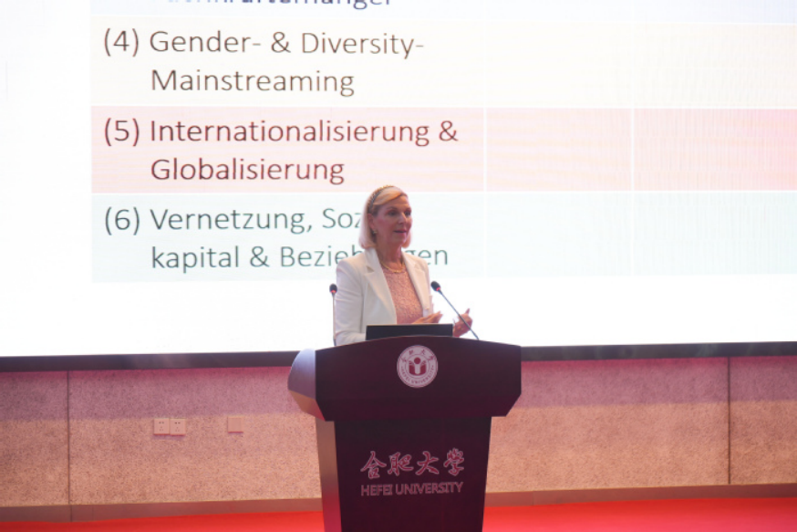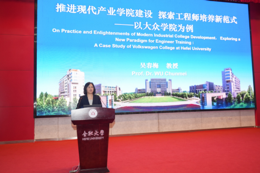 Wu Chunmei, ehemalige Präsidentin der Universität Hefei und stellvertretende Vorsitzende des Politischen Konsultativkomitees der Stadt Hefei, hielt einen Vortrag mit dem Titel „On Practice and Enlightenments of Modern Industrial College Development, Exploring a New Paradigm for Engineer Training: A Case Study of Volkswagen College at Hefei University“.