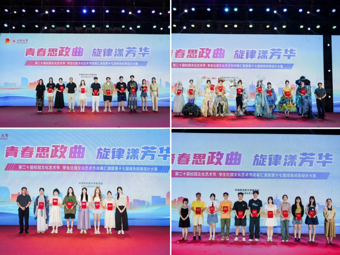 各二级学院的模特身着自行设计的服装作品,在绚丽的舞台上尽情展示风采,传递对自然之美的敬意和对可持续时尚的追求。现场评委对各团队的表现进行综合打分,评选出优秀模特奖、优秀服装设计奖、最佳表演奖及优秀团队奖。
