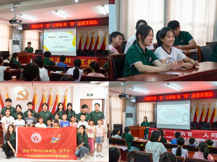 实践团队面向汤池村中小学生开展推广普通话、预防诈骗、相约合大、党史教育等特色课程宣讲活动。团队前期成功申报2024年“推普助力乡村振兴”全国专项团队,开办普通话知识小课堂,通过“绕口令”等小游戏,寓教于乐,向当地小朋友推广普通话,为乡村振兴插上“语言的翅膀”。预防诈骗和相约合大课程围绕“我的梦想”和“我为合大代言”展开,团队向小朋友们介绍了大学校园生活,在拓展乡镇儿童视野的同时,也在他们心里埋下梦想的种子。